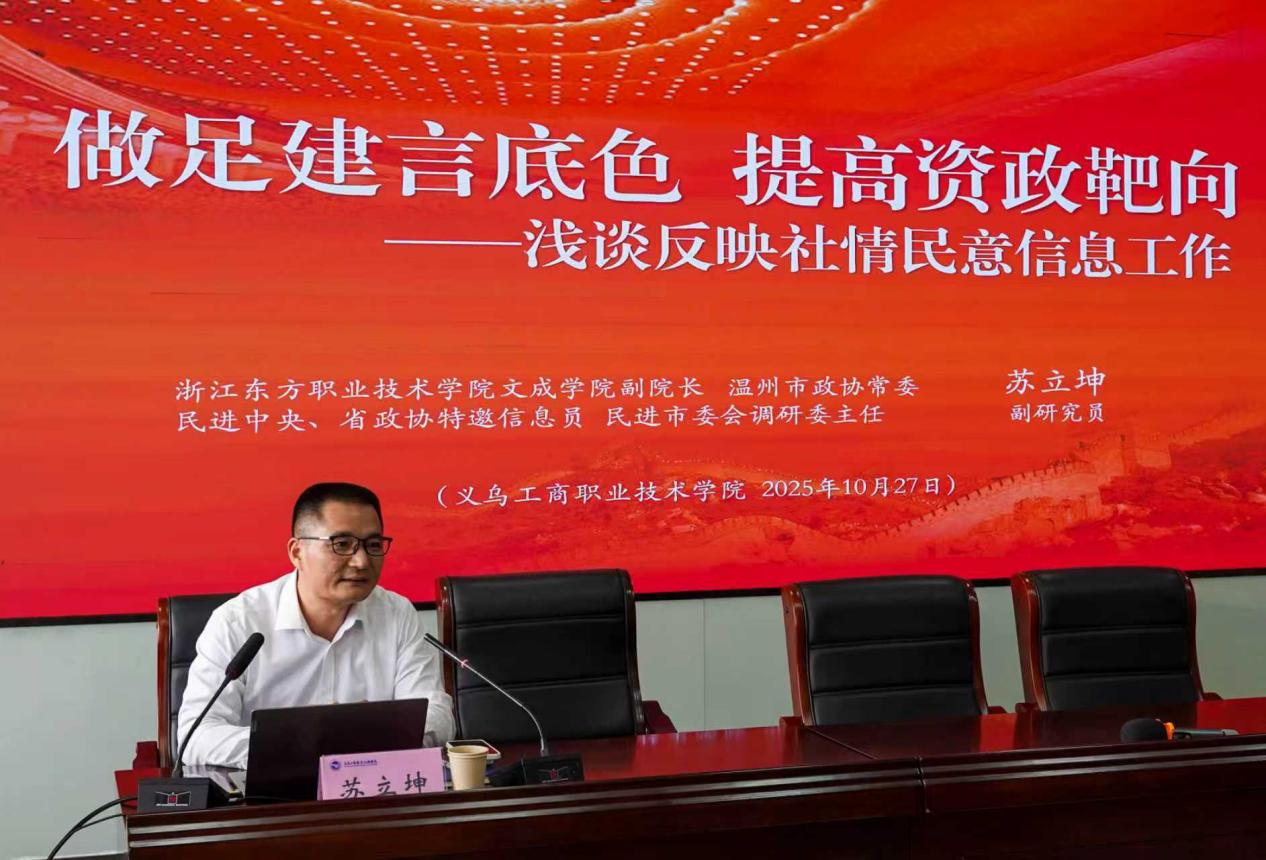 为提升公司统一战线成员参政议政、服务发展的能力水平,进一步提高公司统战工作影响力,10月27日下午,由校统战部、科技处、vsport官方网站(“义商智汇”社情民意信息工作室)联合主办的反映社情民意信息工作专题指导讲座在教师发展中心举行。讲座特邀浙江东方职业技术公司文成公司(航空飞行公司)副经理、政府公共政策与文化治理研究中心主任、民进中央参政议政特邀信息员、浙江省政协特邀信息员、温州市政协常委苏立坤作专题指导。义乌市政协、市民主党派代表、无党派人士代表及公司教师等90余人参加。