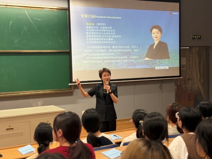 随后,义乌君合税务师事务所所长、高级会计师杨晓娴为新生们带来了一场精彩纷呈的职业规划讲座。结合行业前沿动态和自身丰富的实践经验,深入浅出地分析了数字经济背景下财会行业的变革与机遇,为同学们未来的职业发展方向提供了宝贵的指导和建议,赢得了阵阵掌声。