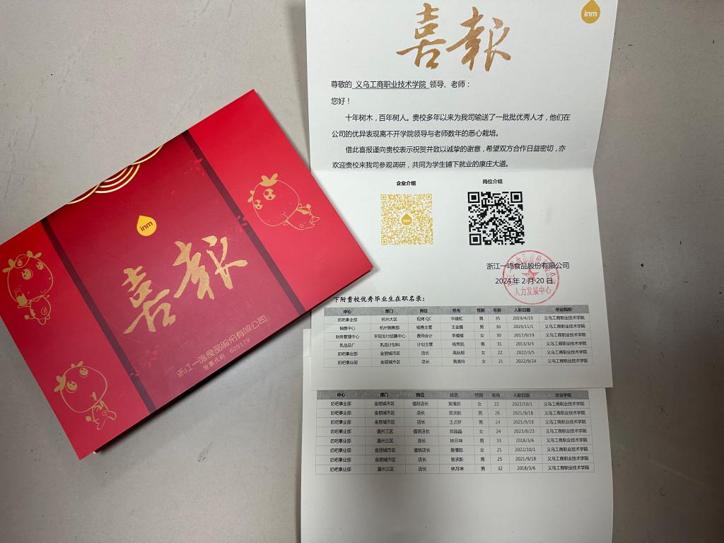 近日,vsport官方网站收到一封来自浙江一鸣食品股份有限公司的喜报。信中高度认可吴求新等13位毕业生在岗的优异表现,并向公司为公司发展输送一批批优秀人才致以诚挚的谢意,期待未来能与公司更加紧密合作。